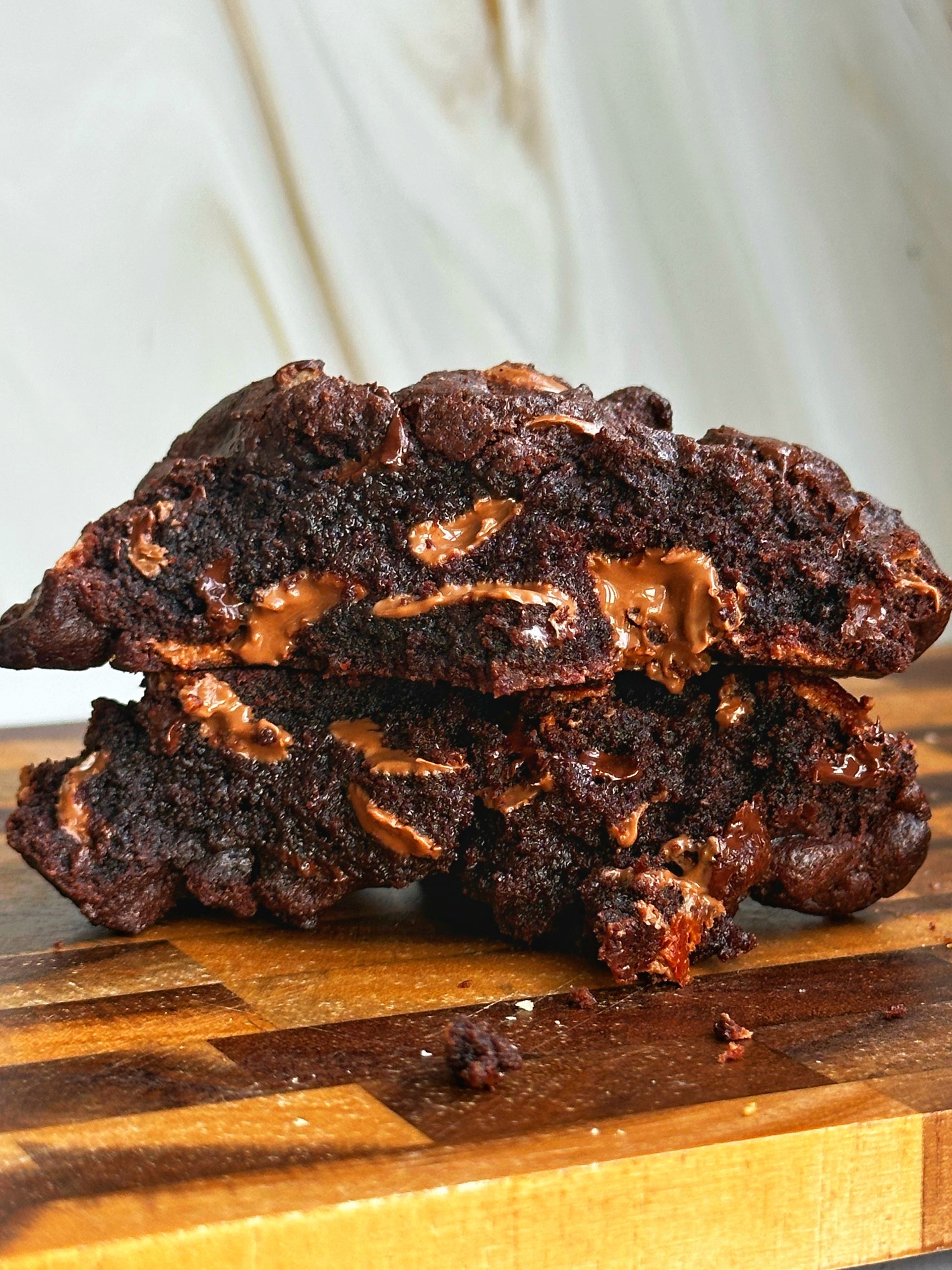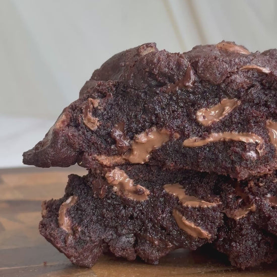 A 4oz cookie with a soft, brownie-like center, made with a rich blend of dark and milk chocolate and crafted using berry cocoa for a deep, slightly fruity cocoa flavor. Balanced in sweetness, bold in taste — pure chocolate bliss.